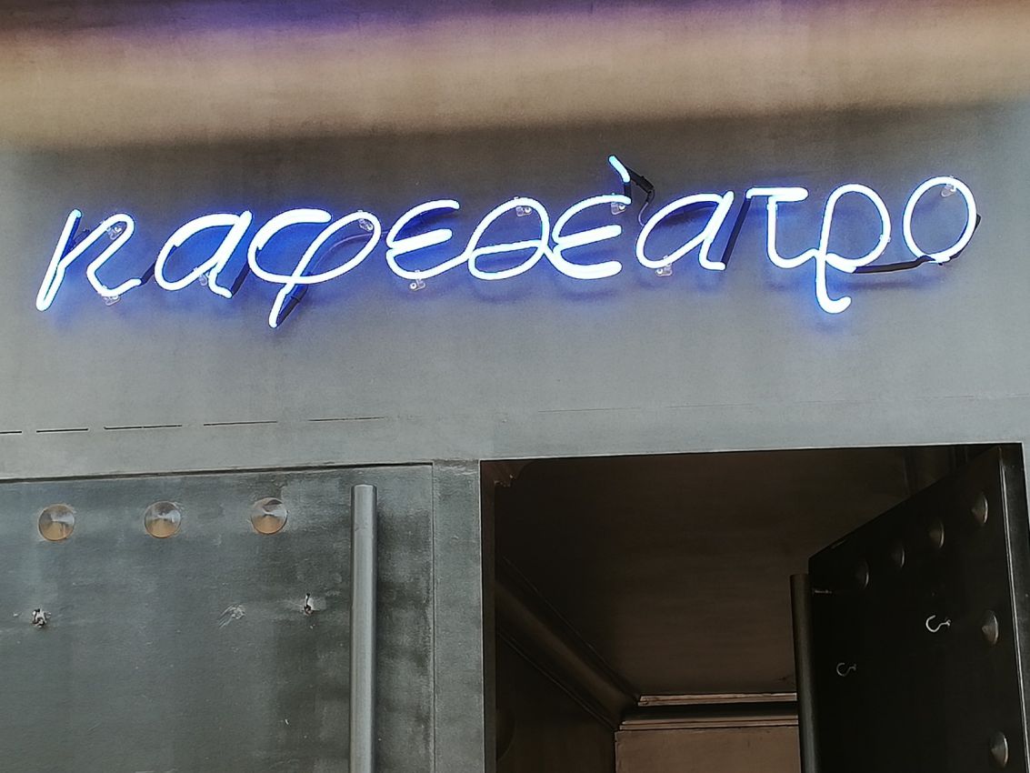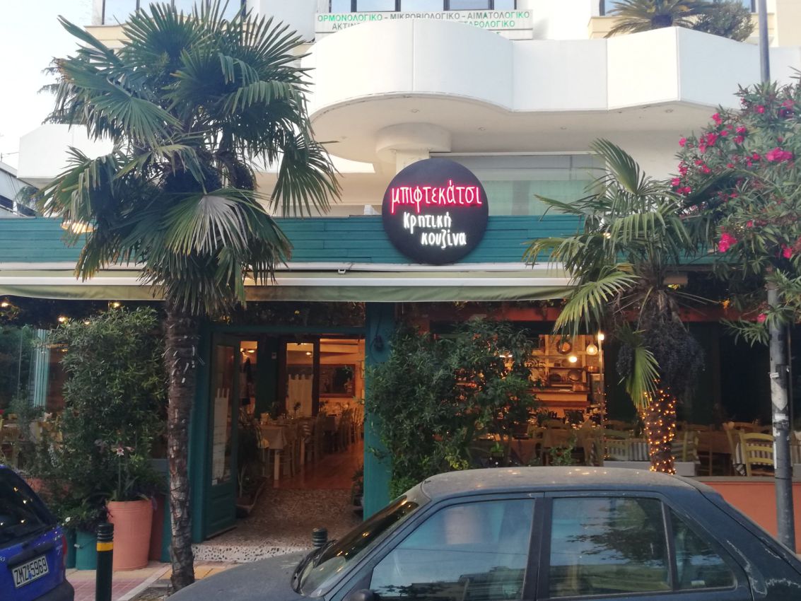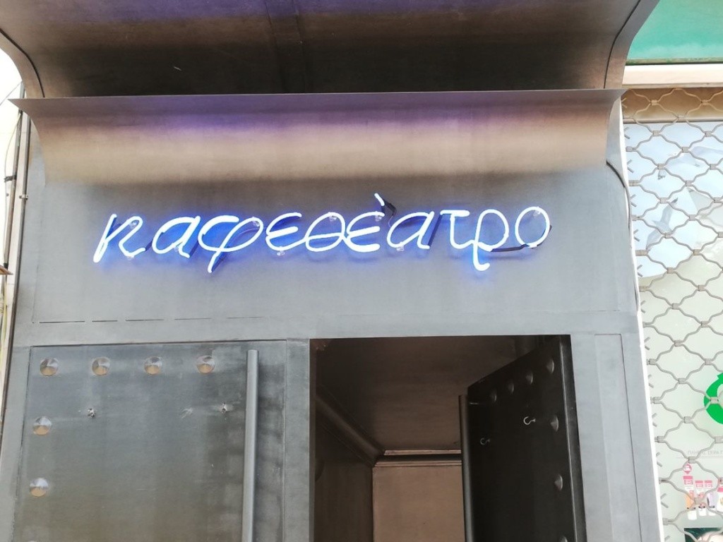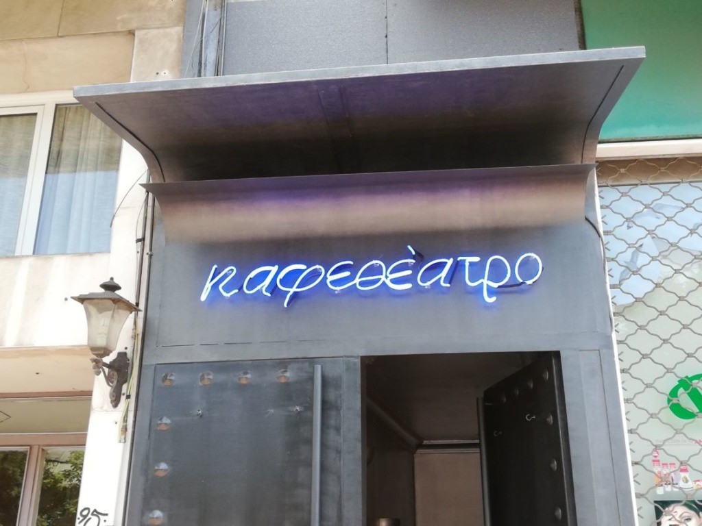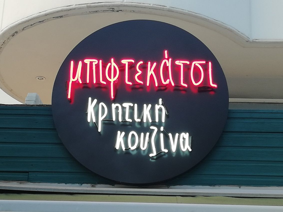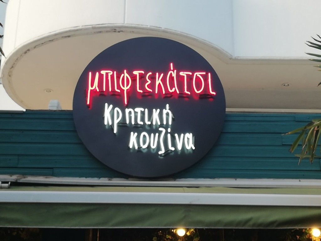 Επιγραφή με μεταλλική πλάτη & Νέον γράμματα στην όψη για το Μπιφτεκάτσι στο Χολαργό.