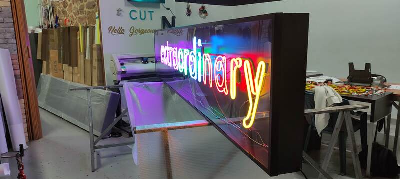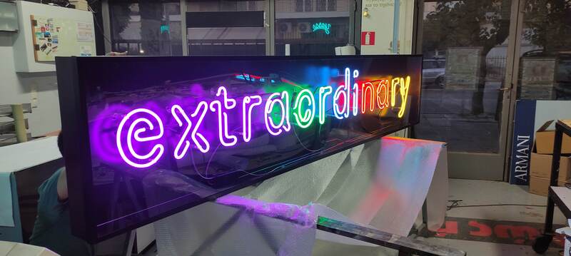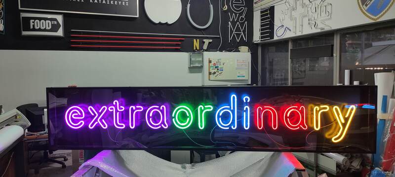 Πολύχρωμες ΝΕΟΝ επιγραφές μεγάλων ή μικρών διαστάσεων τοποθετημένες μέσα σε ειδική μεταλλική κατασκευή, για εσωτερικούς και εξωτερικούς χώρους